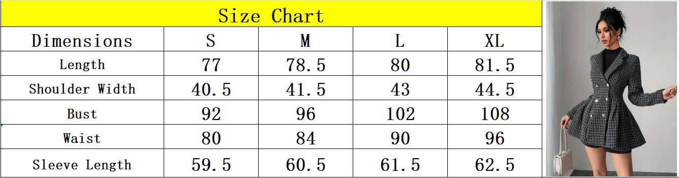 This European and American style winter plaid blazer dress combines classic black-and-white plaid with tweed fabric, creating a retro and luxurious fashion statement. The waist-cinching design paired with double-breasted buttons easily accentuates a slender waist; the ruffled hem softens the rigid lines of the blazer dress, crafting a balanced look that is bright yet full of personality. This single item can be worn alone to create an elegant outfit, or layered as a blazer dress—it is detailed with fashionable elements and suitable for various winter occasions.